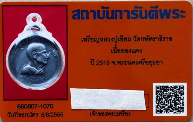 เหรียญหลวงปู่เทียม วัดกษัตราธิราซ เนื้อทองแดง ปี 2518 จ.พระนครศรีอยุธยา (พร้อมบัตรรับรองฯ)