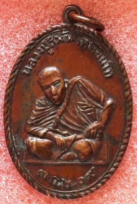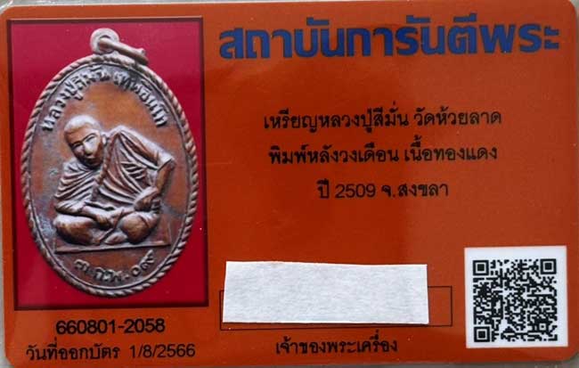 เหรียญหลวงปู่สีมั่น วัดห้วยลาด พิมพ์หลังวงเดือน เนื้อทองแดง ปี 2509 จ.สงขลา พร้อมบัตรรับรองฯ
