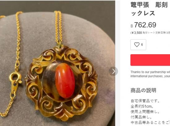 วัสดุ: ตัวจี้ทำจากกระแท้ (Tortoiseshell) ที่มีความโปร่งแสงและลวดลายสวยงาม ประดับด้วยปะการังแท้สีส้มทรงรีตรงกลาง