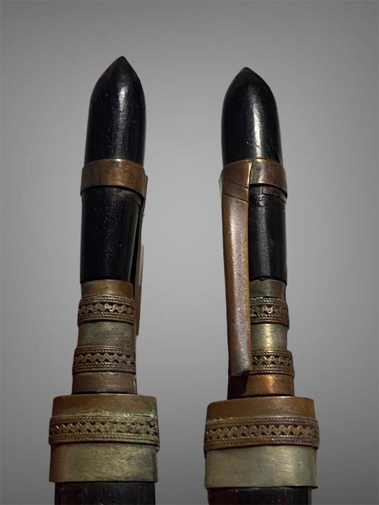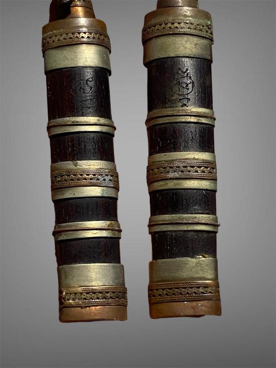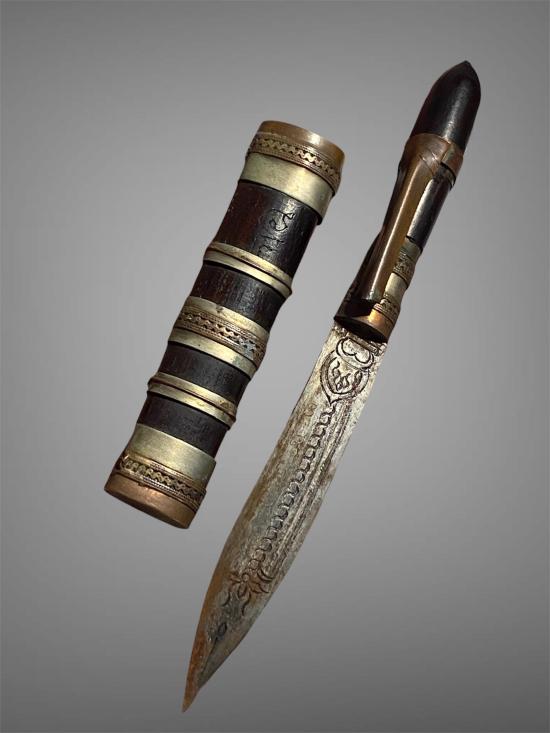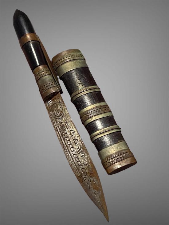 มีดหมอสาริกาเก่า ด้ามมีดไม้ ปลอกมีดไม้ แหนมรัดสามกษัตริย์ ขนาดความยาวรวมด้ามมีด 4.8 นิ้ว ไม่ทราบที่ มีจารย์ที่ใบมีดและปลอกมีด