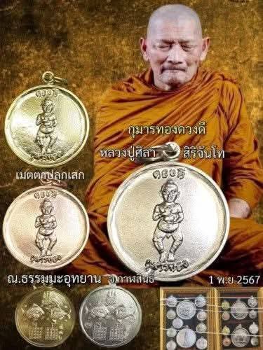 รับ 5 เหรียญ เหรียญกุมารทองดวงดี รุ่นแรก หลังปลาตะเพียนคู่ หลวงปู่ศิลา หลวงปู่มหาศิลา สิริจันโท ออก ณ. ธรรมะอุทยาน จ.กาฬสินธุ์ ปี67 เนื้อกะไหลทอง เลข444+440+466+487×469