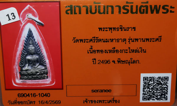 พระพุทธชินราช วัดพระศรีรัตนฯ รุ่นพานพระศรี เนื้อทองเหลืองกะไหล่เงิน ปี2496 จ.พิษณุโลก + บัตร G-pra สภาพเดิมค่ะ