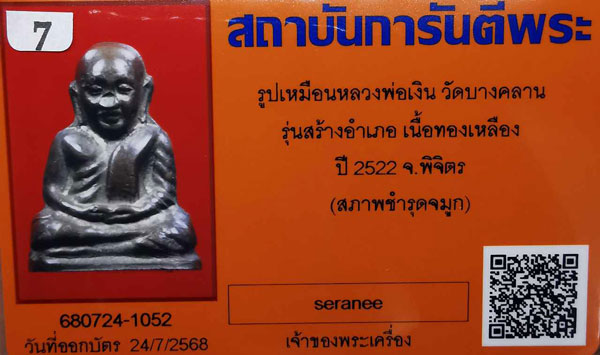 รูปเหมือนหลวงพ่อเงิน วัดบางคลาน รุ่นสร้างอำเภอ เนื้อทองเหลือง กริ่งดัง ปี2522 จ.พิจิตร + บัตรG-pra สภาพระบุตามบัตรรับรอง สภาพตามรุปทุกประการค่ะ