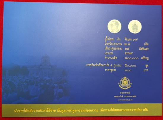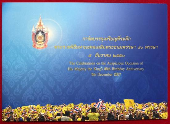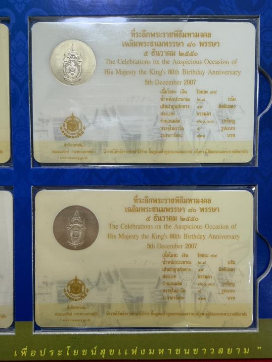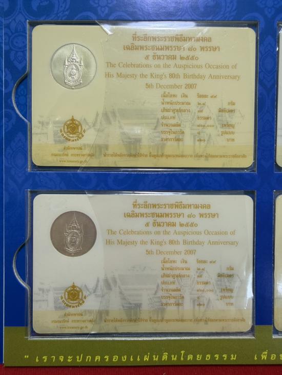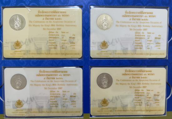 การ์ดบรรจุเหรียญที่ระลึก พระราชพิธีมหามงคลเฉลิมพระชนมพรรษา 80พรรษา 5 ธันวาคม 2550 เนื้อโลหะเงิน 99% จำนวนรวม 4 เหรียญ น้ำหนักรวม 11.2 กรัม ไม่ผ่านใช้ เคาะเดียว