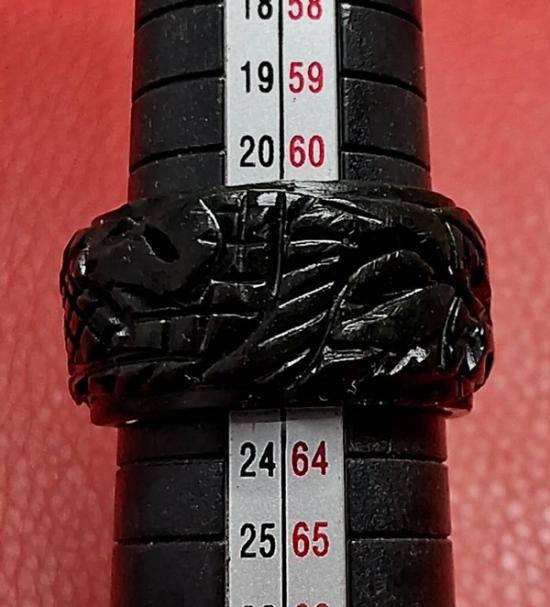 แหวนหยกดำแกะลายมังกร หยกพม่าแท้ 100 % (แสงส่องผ่าน) เส้นผ่าศูนย์กลาง 2.1 ซม. หน้ากว้าง 1.3 ซม. วงใหญ่ๆ หายากและมีราคาค่อนข้างสูง (กท.35)