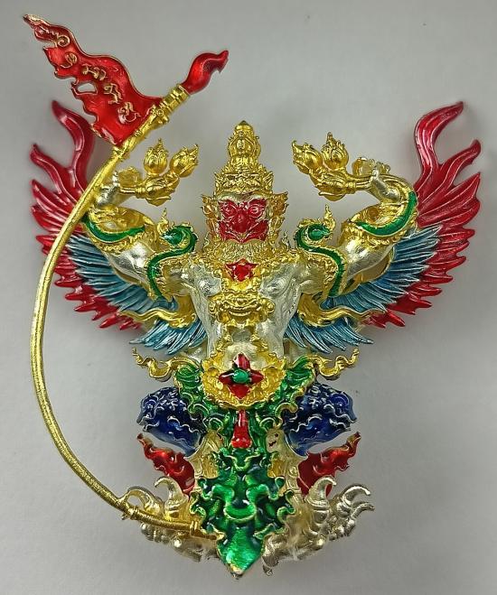พญาครุฑทรงมหิธานุภาพ "เชิญธงมหาเศรษฐี(ครุฑรุ่น4)" วัดครุฑธาราม (จ.อยุธยา) เนื้อตริยะโลหะ ชุบ2K ลงยาราชาวดี (พิมพ์ใหญ่ สูง4.5ซ.ม.) เบอร์ 1099 พร้อมกล่องเดิมครับ