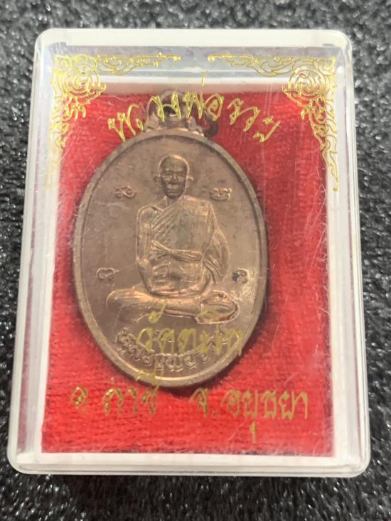 เหรียญรูปไข่ หลวงพ่อรวย วัดตะโก อยุธยา ปี 2539 เนื้อนวะโลหะ ตอกโค๊ต รวย สวยมาก มีกล่องเดิมครับ
