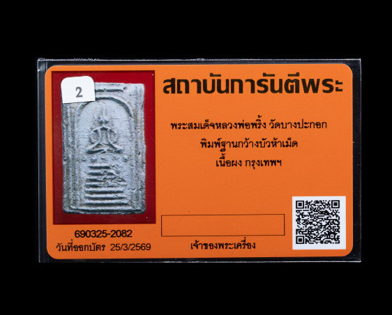 พระหลวงพ่อพริ้ง วัดบางปะกอก กรุงเทพฯ หนึ่งในพิมพ์นิยมสุด.. พระสมเด็จ พิมพ์ฐานกว้าง บัว 5 เม็ด เนื้อเทา ผงใบลาน + บัตรรับรอง G-PRA