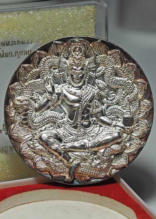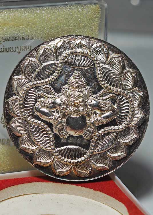 --(เนื้อเงิน )--เหรียญบาตรน้ำมนต์ องค์พ่อจตุคามรามเทพ รุ่นสู้แล้วรวย วัดพระมหาธาตุวรมหาวิหาร ปี 2550 ขนาด 5.5 เซนติเมตร มีโค้ดและหมายเลข พร้อมกล่องเดิม