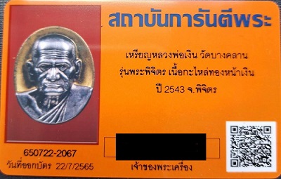 หลวงพ่อเงินวัดบางคลาน รุ่นพระพิจิตร พ.ศ.2543 กระไหล่ทองหน้าเนื้อเงิน หลวงปู่หมุนปลุกเสก