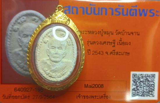 พระหลวงปู่หมุน วัดบ้านจาน รุ่นดวงเศรษฐี เนื้อผง ปี2543 จ.ศรีสะเกษ เลี่ยมทองพรัอมบัตรรับรอง(1)