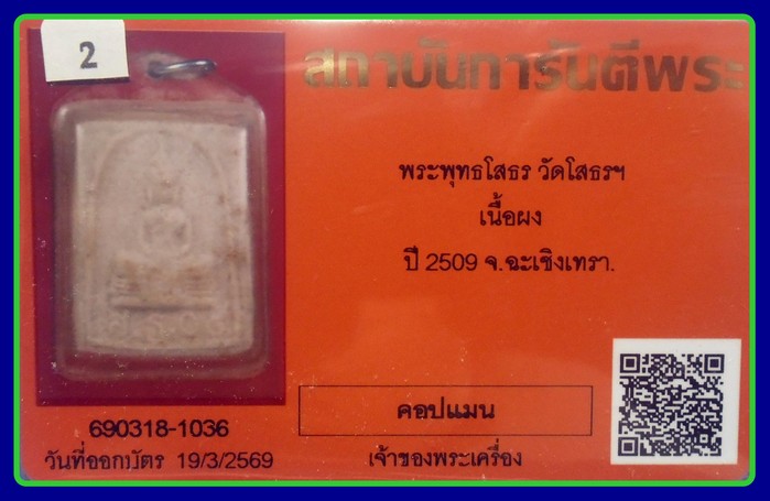 บัตรการันตี -600-พระผงหลวงพ่อโสธร วัดโสธรฯ จ.ฉะเชิงเทรา พศ.2509