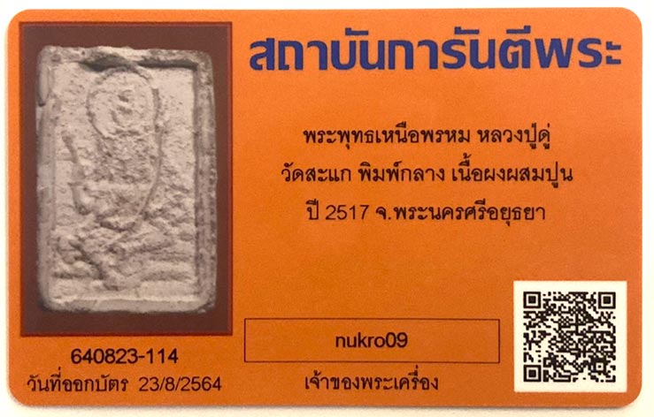 **พร้อมบัตรรับรอง** องค์นี้หลังมีตรายางประทับ ด้านหน้ามีพระธรรมธาตุ