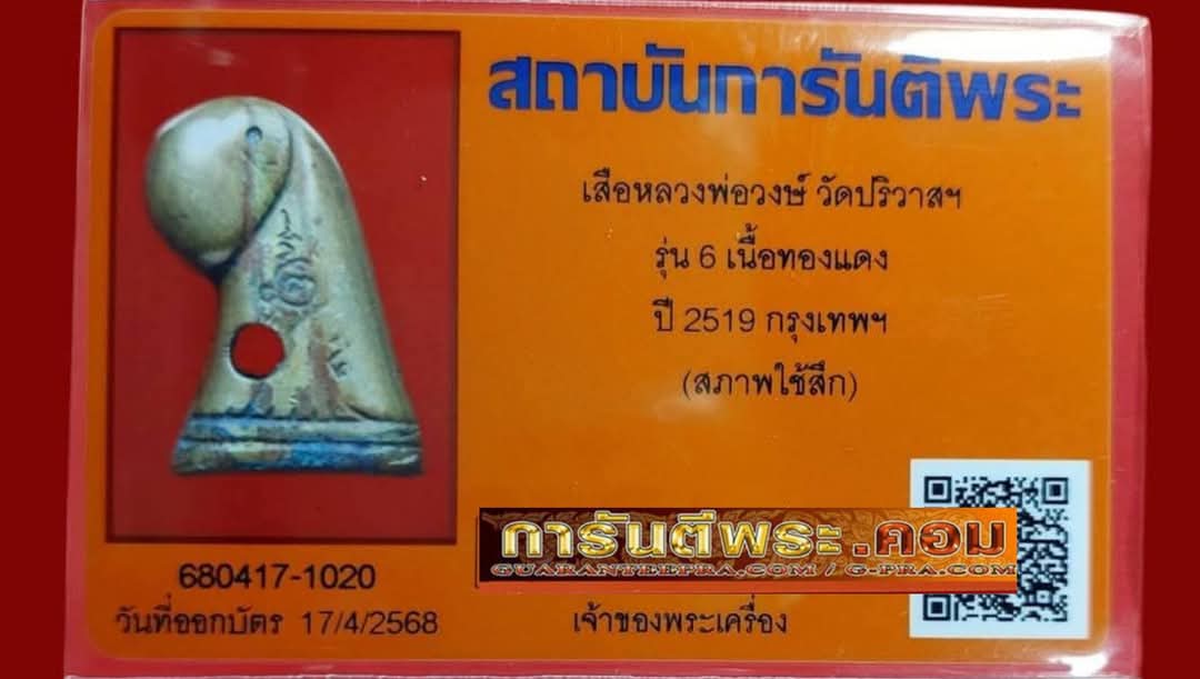 เสือหลวงพ่อวงษ์ รุ่น 6 เนื้อทองแดง วัดปริวาศ ปี 2519 พร้อมบัตรรับรอง