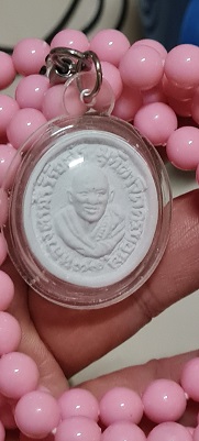 พระผงจักรพรรดิ์ หลวงตาม้า วัดถ้ำเมืองนะ พร้อมรอยจารหลวงตาม้า เลี่ยมจากวัดพร้อมประคำชมพูรักแท้