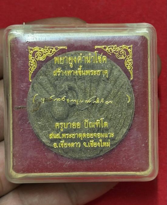 รายละเอียด พญายูงคำนำโชค รุ่นแรก ครูบาออ ปัณฑิต๊ะ สำนักสงฆ์พระธาตุดอยจอมแวะ เนื้อผงพุทธคุณ ติดก้านธูปเสกและผ้าจีวร พิธีพุทธาภิเษก เมื่อวันอังคารที่ ๒๐ พฤศจิกายน พ.ศ.๒๕๕๕ ขึ้น ๗ ค่ำ เดือน ๑๒ จัดสร้างจำนวน ๒,๙๙๙ ตัว ด้านหน้าเป็นรูปนกยูงแพนหาง ปากคาบถุงเพชร เท้าซ้ายจับถุงเงิน เท้าขวาจับถุงทอง ด้านหลังเป็นยันต์ดอกแก้ว ฝังก้านธูปเสกและผ้าจีวรของท่าน เด่นด้าน เรื่องโภคทรัพย์ เมตตามหานิยม โชคลาภ เครื่องรางรูปนกยูงแพนหาง ปากคาบถุงเพชร เท้าซ้ายจับถุงเงิน เท้าขวาจับถุงทอง ด้านหลังเป็นยันต์ดอกแก้ว อันเป็นมหายันต์โภคทรัพย์ของล้านนา ฝังก้านธูปอธิฐาน และผ้าจีวรของท่าน สร้างจากผงวิเศษตำหรับคัมภีร์หอคำหลวงไทยใหญ่ นี่แหละเครื่องรางสร้างตัว และสร้างมหาเศรษฐีของท่านละ ครูบาออ กล่าวถึงพระมนต์ และพระยันต์ยูงคำ ของท่านว่า ครูบาอาจารย์ชาวไทยใหญ่ ถือว่านกยูง เป็นราชินีแห่งสัตว์ทั้งปวง เป็นแม่ของโลก เป็นเจ้าแห่งเงินทอง ศิริมงคล ทรัพย์สินโภคสมบัติ และขุมทรัพย์ทั้งปวงที่บังเกิดในโลกนี้ นกยูงนั้นงามสง่า เวลาแพนหาง สัตว์ทั้งป่า ยังต้องหยุดมอง ท่านว่า มันแพนหางเมื่อใด ช้างต้องหยุดประสมโขลง สิงห์สัตว์ ต้องหยุดเดิน หยุดวิ่ง หยุดกินอาหาร ปลาหยุดว่าย นกหยุดบิน นี่มันตะลึงตา ตะลึงใจอย่างนี้ เสียงมันร้องก็เพราะดุจเสียงพรหม สิงห์สัตว์ได้ยิน ก็ต้องหยุดฟังเช่นกัน มันสะกดใจสัตว์ได้ ใจคนได้ มันสะกดทรัพย์สินเงินทองให้หลั่งไหลเข้ามาได้ มันจึงเป็นเจ้าแห่งใจ เจ้าแห่งทรัพย์ เมื่อพกพามันไปด้วย ก็จะสะกดใจผู้คนรอบข้าง ที่เขามีเงินทอง ก็ให้ใช้ทรัพย์สินเงินทองของเขาได้ ที่เขามีโอกาส ก็ให้โอกาสแก่เรา ใครเขามีอะไร ก็มอบให้เราด้วยความยินดีทั้งสิ้น ทำการงาน ค้าขายสิ่งใด ก็สมความปรารถนาในสิ่งนั้น ไม่นานก็มีเงิน ไม่นานก็เป็นเศรษฐี มหาเศรษฐี ด้วยเหตุนี้คนที่มียูงคำนำโชค ของครูบาออ และเป็นคนสู้ชีวิต ไม่ย่อท้อ ไม่เกลียดคร้าน จึงร่ำรวยทุกคน