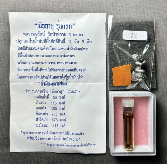 คุ้มภัยให้ลาภ! มัจฉานุรุ่นแรก หลวงพ่อรัตน์ วัดป่าหวาย "เนื้อชินตะกั่ว" เลขมงคลรวย "88" ปลุกเสกในน้ำมันสีผึ้ง (พร้อมน้ำมันสีผึ้งและจีวร) |