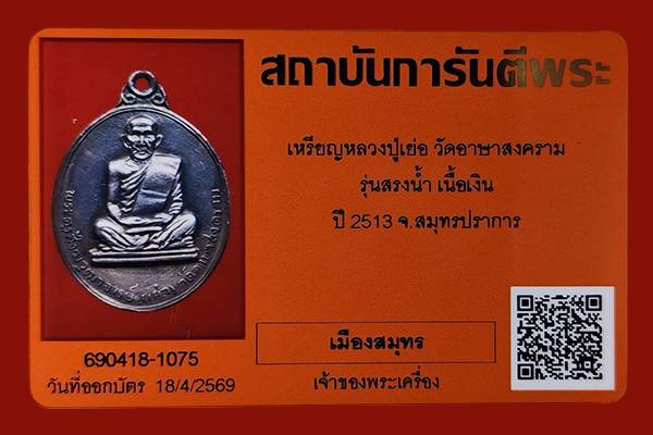 เหรียญหลวงปู่เย่อ วัดอาษาสงคราม รุ่นสรงน้ำ เนื้อเงิน ปี 2513 จ.สมุทรปราการ จำนวนสร้าง 65 เหรียญ พร้อมบัตรG....