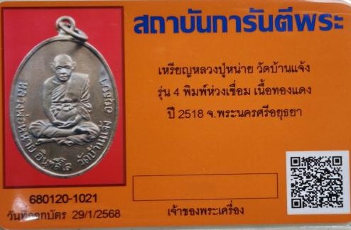 เหรียญหลวงปู่หน่าย วัดบ้านแจ้ง รุ่น4 นิยม พิมพ์ห่วงเชื่อม เนื้อทองแดง ปี 2518 อยุธยา บัตรรับรอง