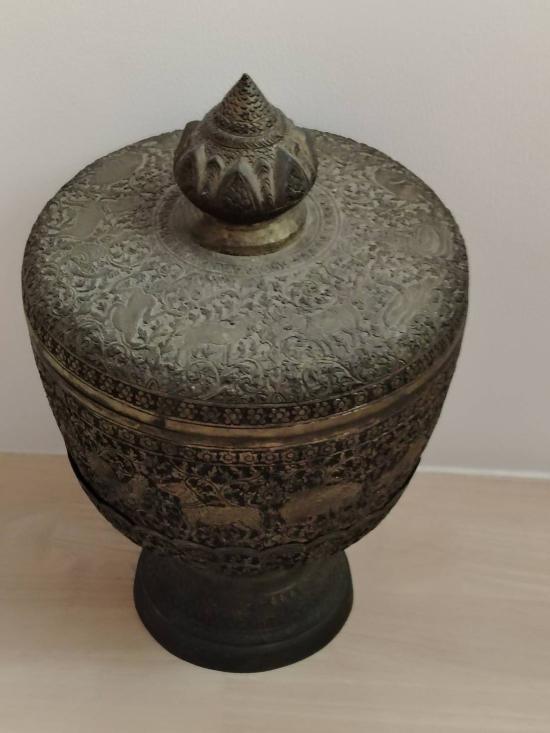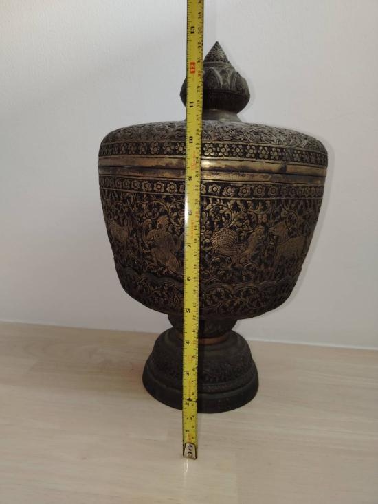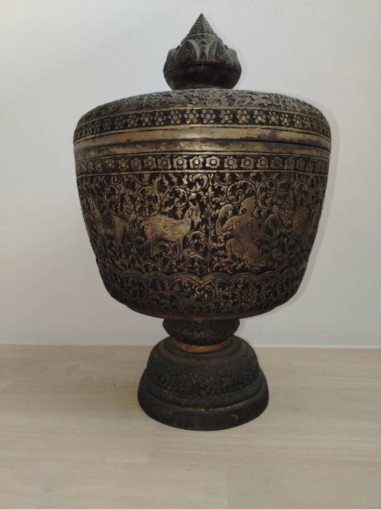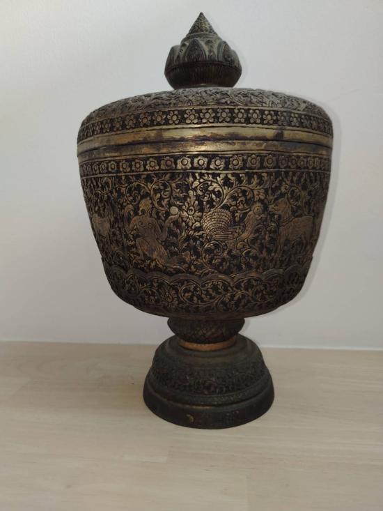 ขันน้ำมนต์ลายป่าหิมพานต์สูงประมาณ 13 นิ้วขนาดใหญ่ทั้งพานทั้งขันมีฝาครอบอายุเกิน 30 ปีเก่าสนใจรับไปบูชาหรือนำไปใช้ต่อได้ขอท่านที่พร้อมโอน
