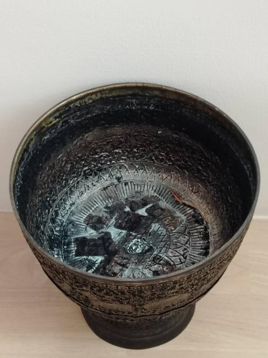 ขันน้ำมนต์ ลายหิมพานต์ เนื้อโลหะไม่ทราบชนิด อายุเกิน30ปี ขนาดใหญ่