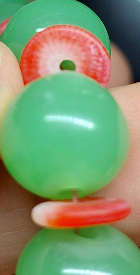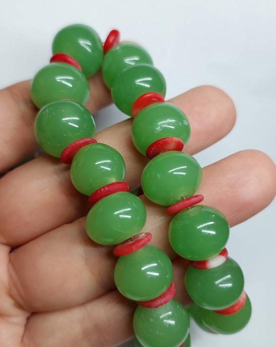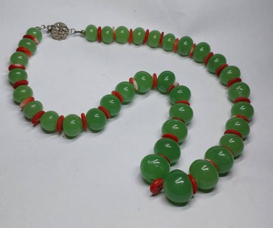 ***วัดใจ***สร้อยคอลูกปัดแก้วเก่าสีเหยกขียว สลับ ปะการังแดง ญี่ปุ่น ยาว 18 นิ้ว