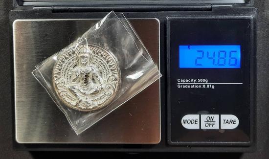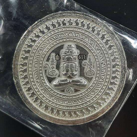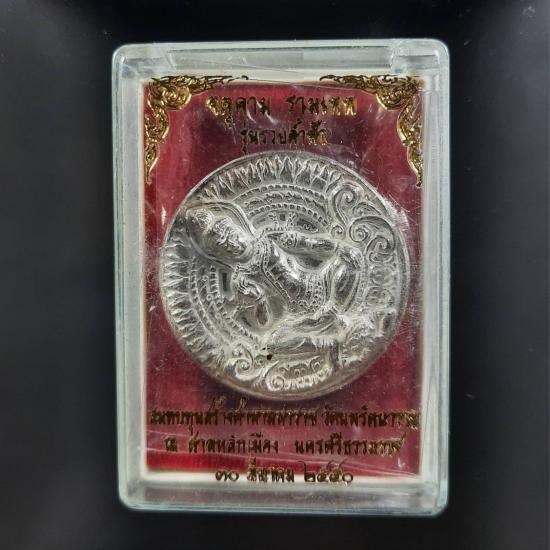 เหรียญจตุคามรามเทพ รุ่นรวยค้ำฟ้า สบทบทุนศาลามหาราช วัดนพรัตนาราม จ.นครศรีธรรมราช ขนาด 3.2 ซม.เนื้อเงิน หมายเลข 611 กล่องเดิมจากวัด |
