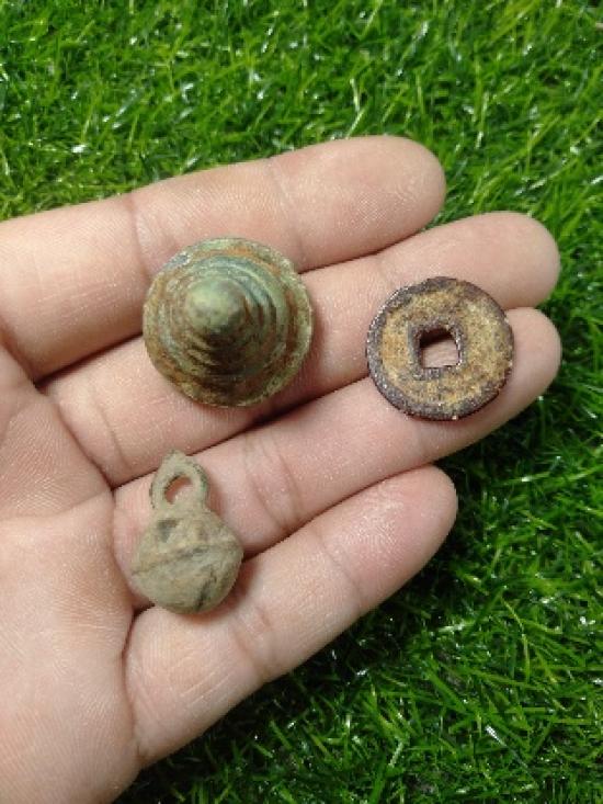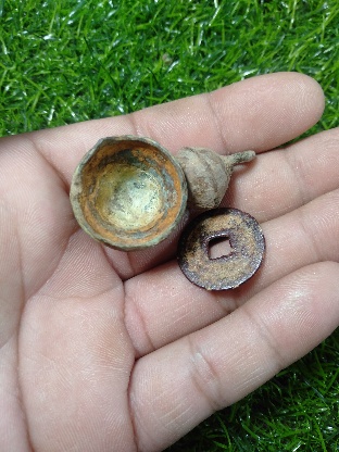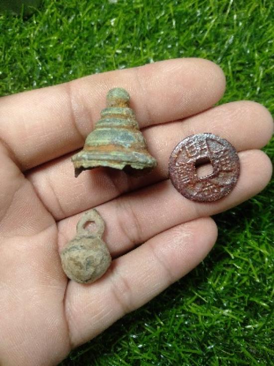 ของโบราณ กระพรวน เนื้อสัมฤทธิ์ เหรียญอีแปะจีนเรียกทรัพย์ จากแม่น้ำสิงห์บุรี