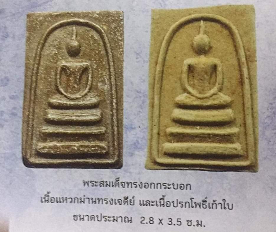 พระสมเด็จอกกระบอก เนื้อผงน้ำมันเนื้อแหวกม่านทรงเจดีย์และโพธิ์9ใบ เนื้อมวลสารที่สร้าง ลักษณะเนื้อแบบเดียวกันกับแหวกม่านทรงเจดีย์ และพระลีลาถ้ำหีบเนื้อผงน้ำมัน และพระพิมพ์ขี่ไก่เนื้อผงน้ำมัน เนื้อพระจะมีสีออกน้ำตาลเข้มๆ ผสมมวลสารหลายชนิด พิมพ์มาตรฐานในหนังสือพระเครื่องหลวงพ่อกวย สภาพสวยเดิมๆ ของดีราคาเบาๆแบ่งกันไปใช้ องค์จริงตามรูป |