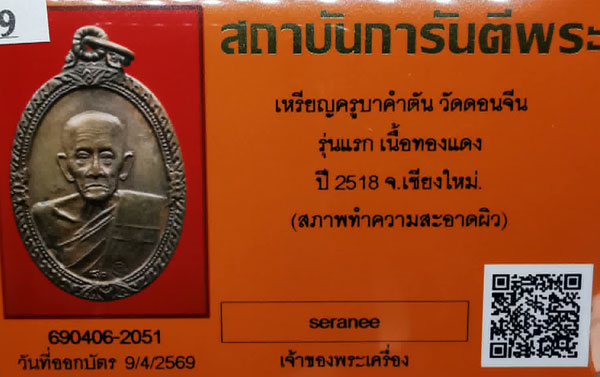 เหรียญครูบาคำตัน วัดดอนจีน รุ่นแรก เนื้อทองแดง ห่วงเดิม ปี2518 จ.เชียงใหม่ + บัตรG-pra