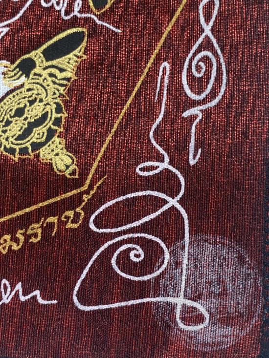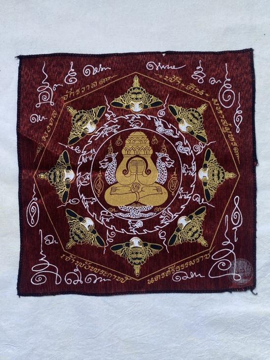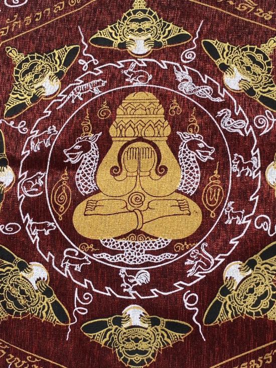 เคาะเดียวแดง ผ้ายันต์ พังพระกาฬ เสริมดวง อุดมมงคล รุ่นมงคลจักวาล ขนาด30/30ซม มีตราประทับ สีแดง |