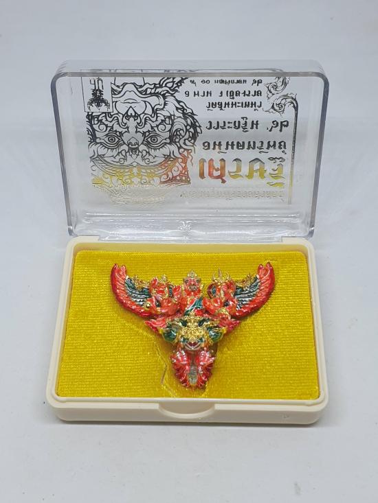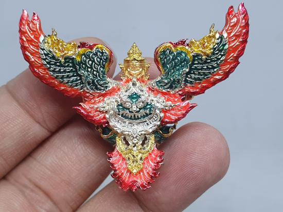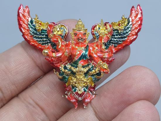 พญาครุฑเศรษฐีอนันตทรัพย์ พระอาจารย์วิรุต วัดสันมะเหม้า จังหวัดเชียงราย เนื้อชนวนทองขาว ลงยาองค์ชมพู พิมพ์ใหญ่ |