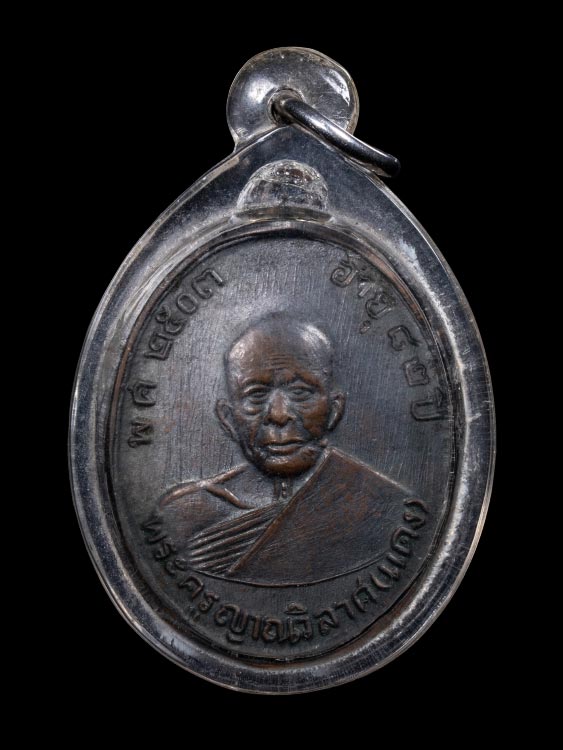 เหรียญหลวงพ่อแดง วัดเขาบันไดอิฐ ปี 2503 เนื้อทองแดงรมดำ เลี่ยมพลาสติกกันผิว จ.เพชรบุรี