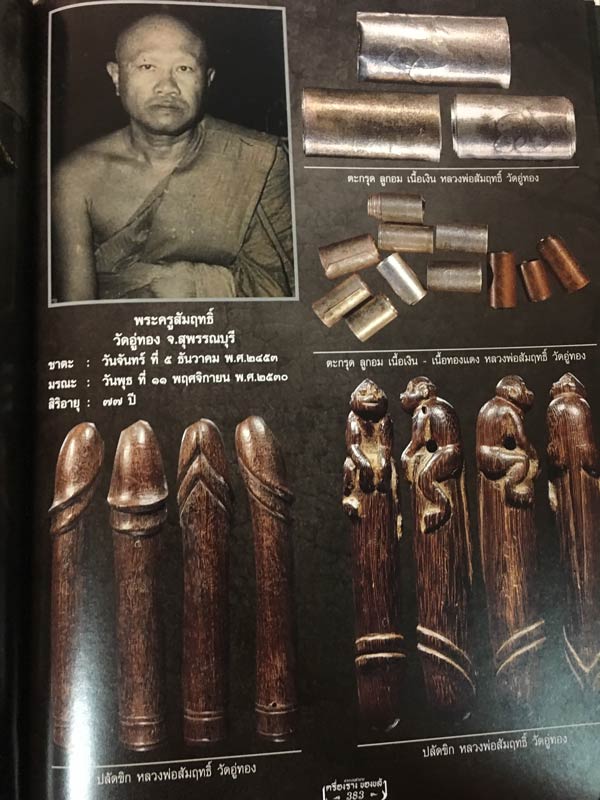 ท่านจึงย้ายมาอยู่ที่วัดอู่ทอง สุพรรณบุรี ซึ่งท่านก็ได้ทำปลัดขิกออกให้ประชาชนที่นับถือนำไปบูชาติดตัว แต่ท่านได้ลงอักขระเพิ่มเติม เพื่อไม่ให้ซ้ำกับปลัดขิกของ ลพ.อี๋ ผู้เป็นอาจารย์ คือท่านได้ลงยันต์พุทธซ้อน (ตามตำราวัดสุทัศน์) ไว้ที่ลำตัวด้านบนของปลัดขิก ภายหลังจากที่ลพ.สัมฤทธิ์ มรณะภาพ ยังมีปลัดขิกที่ท่านทำไว้ตกค้างอยู่ที่กุฎิท่านพอสมควร ซึ่งมีบางส่วนได้แกะเป็นรูปปลัดขิกแล้ว แต่ท่านยังไม่ได้ลงอักขระกำกับ คณะกรรมการวัดคิดว่าปลัดขิกที่ยังไม่ลงอักขระ ลพ.สัมฤทธิ์ท่านคงยังไม่ได้ปลุกเสก จึงนำไปเผาไฟ แต่ปรากฎว่าปลัดขิกเหล่านี้ ไม่ไหม้ไฟ ซึ่งเมื่อมีประสพการณ์เห็นๆ ปลัดขิกทั้งหมด ปลัดขิกของท่านใช้ดีทางเมตตามหานิยม มหาเสน่ห์ ค้าขาย และคุ้มกันภัยต่างๆ สภาพสวย น่าใช้มากครับ