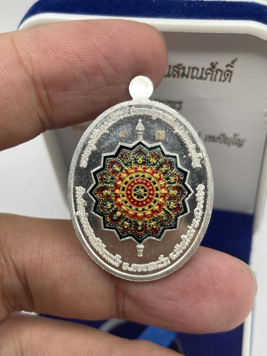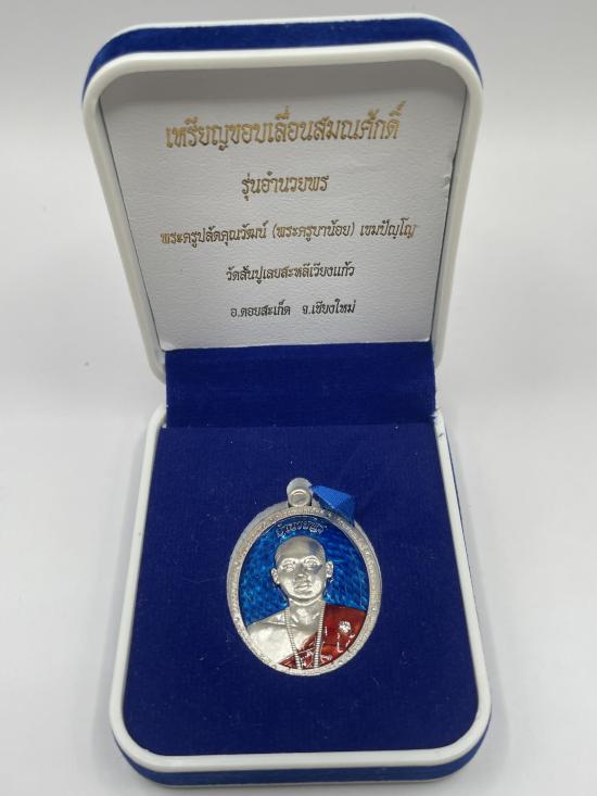 เหรียญเลื่อนสมณศักดิ์ รุ่นอำนวยพร ครูบาน้อย วัดสันปูเลยสะหลีเวียงแก้ว จ.เชียงใหม่ เนื้อเงิน ลงยา หมายเลข 9