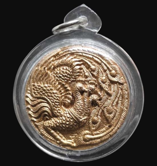 No.2 พญายูงคำนำโชค ครูบาออ รุ่น 3 นกยูงสามหัว กรรมการ ด้านหน้าทาทอง ด้านหลังทาเงินเลี่ยมกันน้ำพร้อมใช้ เนื้อผงพุทธคุณตำรับหอคำหลวง