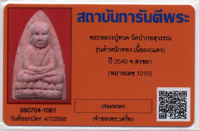 หลวงปู่ทวด รุ่นตำหนักทอง หลวงปู่ทอง สุสังวโร วัดป่ากอสุวรรณาราม อ.นาหม่อม จ.สงขลา ปี2540 เนื้อผงแดงหลังติดแผ่นเงินตอกโค้ดตอกเลข พร้อมบัตร สุดคุ้ม