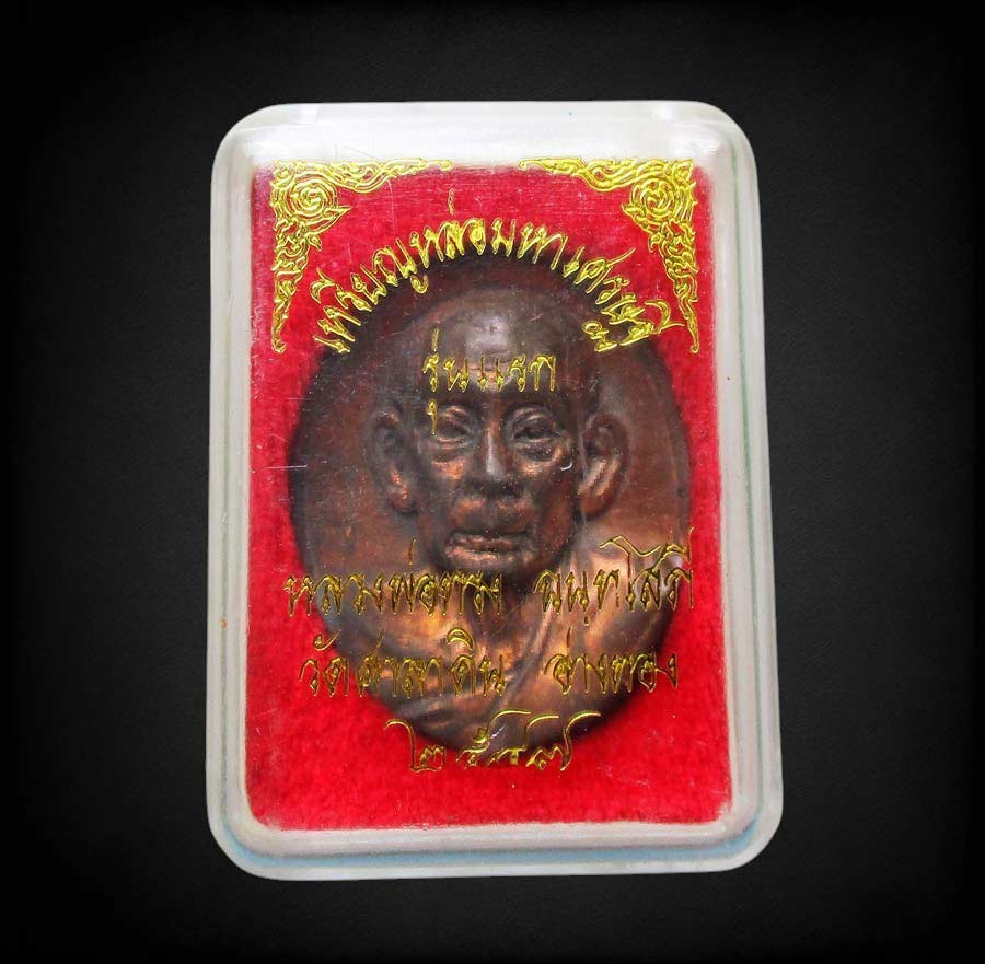 เหรียญหล่อมหาเศรษฐี รุ่นแรก หลวงพ่อทรง วัดศาลาดิน จ.อ่างทอง พ.ศ.2547 เนื้อนวะโลหะ ตอก 4 โค๊ต สภาพสวยพร้อมกล่องเดิม !!