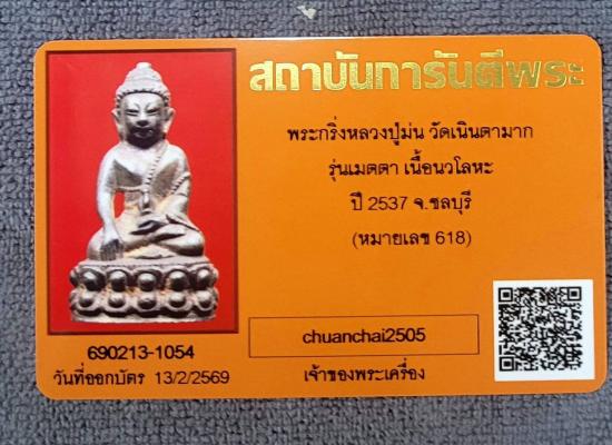 พระกริ่งหลวงปู่ม่น เนื้อนวโลหะ ที่ระลึกสร้างโรงพยาบาล "รุ่นเมตตา" วัดเนินตามาก จ.ชลบุรี ปี 2537 (กล่องเดิมจากวัด)เลข618