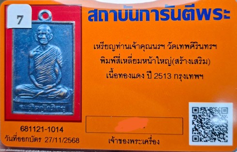 เหรียญท่านเจ้าคุณนรฯ วัดเทพศิรินทรฯ พิมพ์สี่เหลี่ยมหน้าใหญ่ เนื้อทองแดง ปี 2513 จ.กรุงเทพฯ