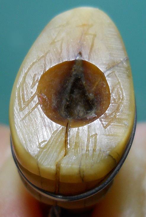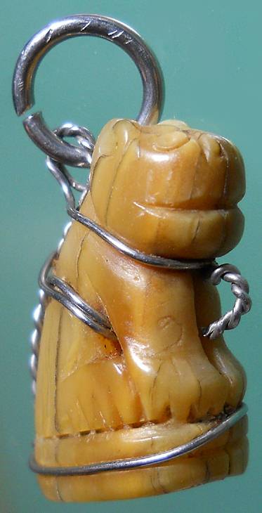 - ยันต์กอหญ้า ยันต์ที่จารใต้ฐานจะมีลักษณะม้วนกลมซ้อนกันคล้ายกอหญ้า