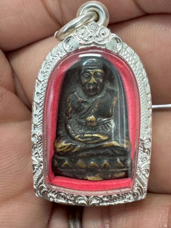 พระหลวงปู่ทวดหลังตัวหนังสือ วัดม่วง(หนองแขม)กรุงเทพฯ เนื้อโลหะผสมรมดำ ปี 2505