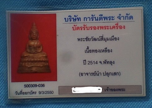 พระชัยวัฒน์สี่มุมเมือง เนื้อทองเหลือง ปี 2514 จ.พัทลุง อ.นำ ปลุกเสก พร้อมบัตรรับรองพระแท้ สบายใจสบายตา องค์จริงดูสวยงาม (ขออนุญาตใช้ภาพเจ้าของเดิมครับ)