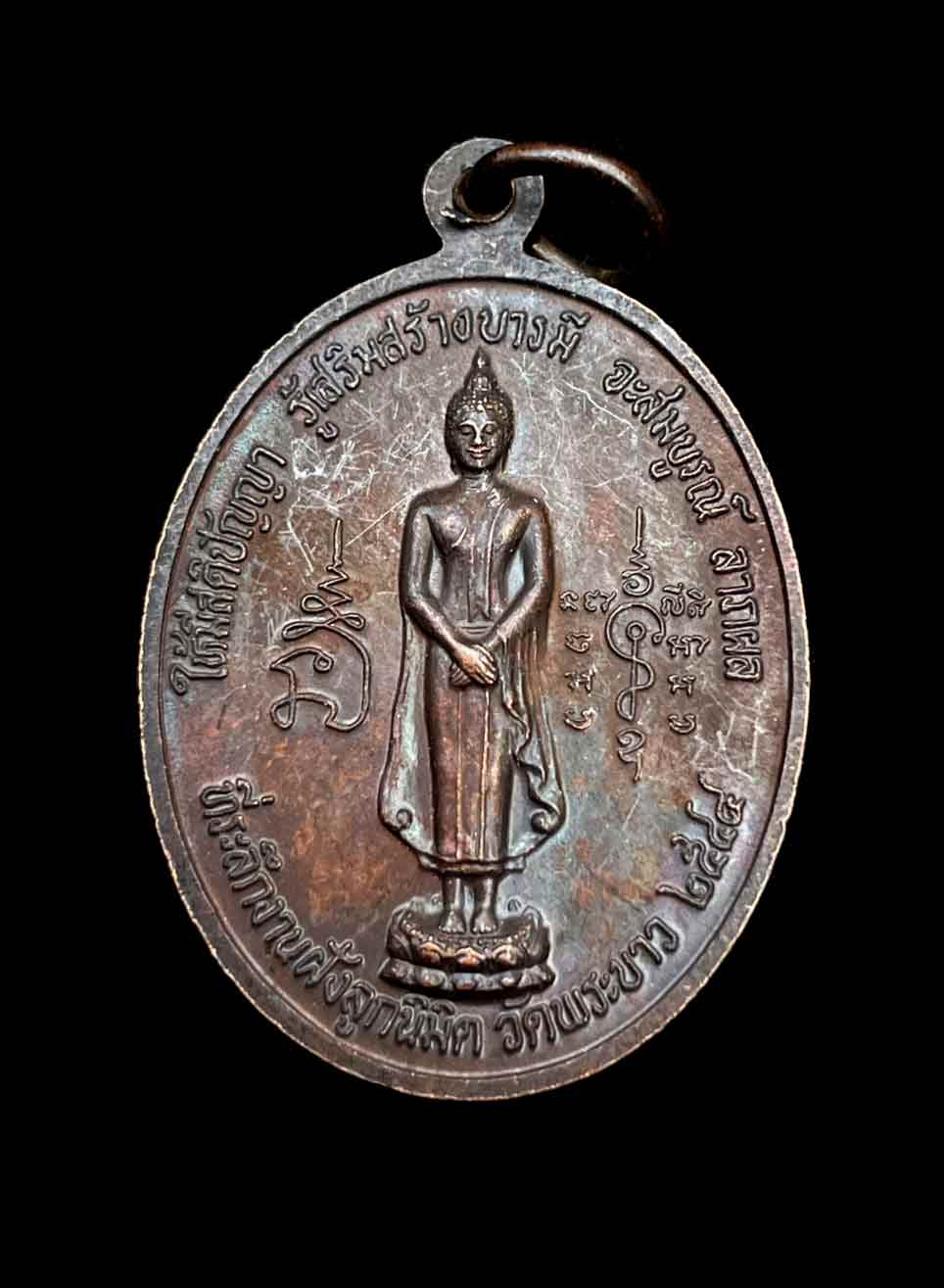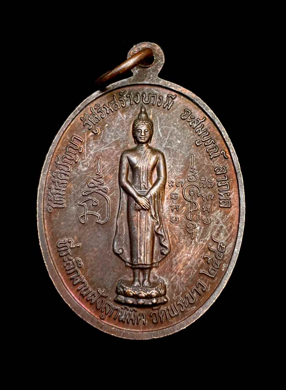 เหรียญที่ระลึกงานฝังลูกนิมิต ปี 2544 หลังพระพุทธปางถวายเนตร พระประจำวันอาทิตย์ เนื้อทองแดง