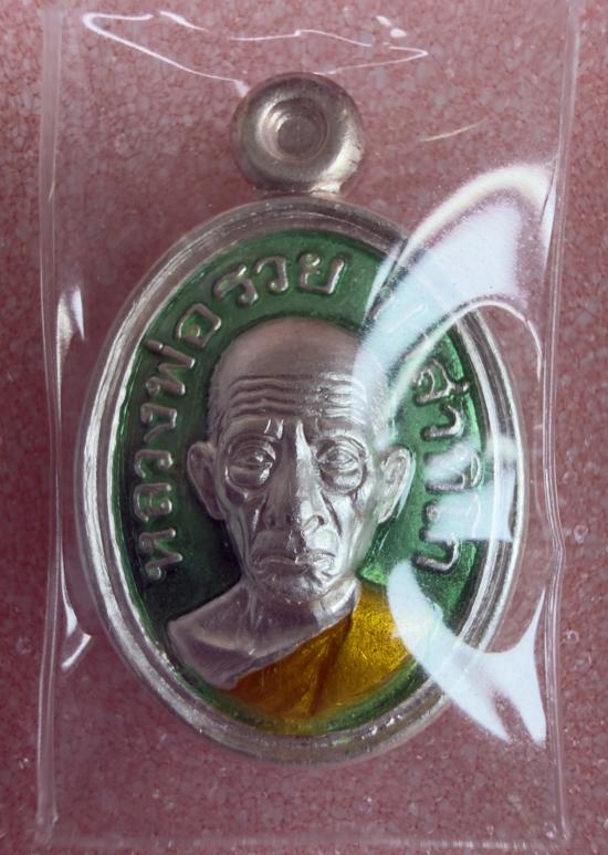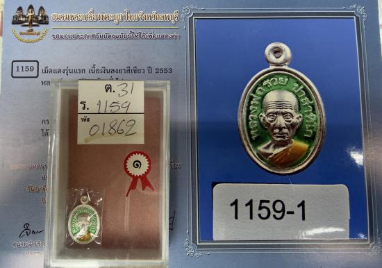 หลวงพ่อรวย วัดตะโก จ.อยุธยา เม็ดแตงรุ่นแรก ปี 2553 เนื้อเงินลงยาสีเขียว เลข 938 พร้อมรางวัลงานประกวดที่ 1