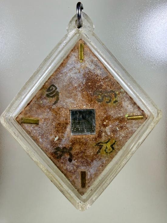 ด้านหลังประดับกระจกคันฉ่อง ใช้สะท้อนสิ่งชั่วร้าย ปราบศัตรู แผ่นกระจกผ่านการปลุกเสกจากยอดเกจิ แก้ดวงตก ดวงชง