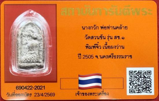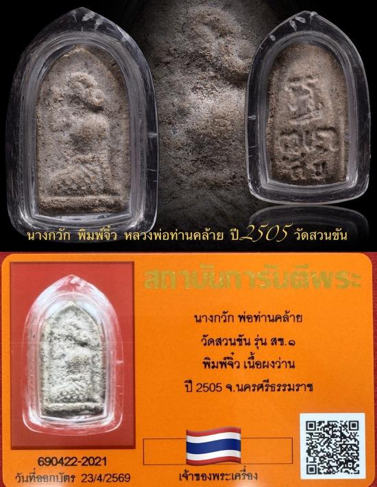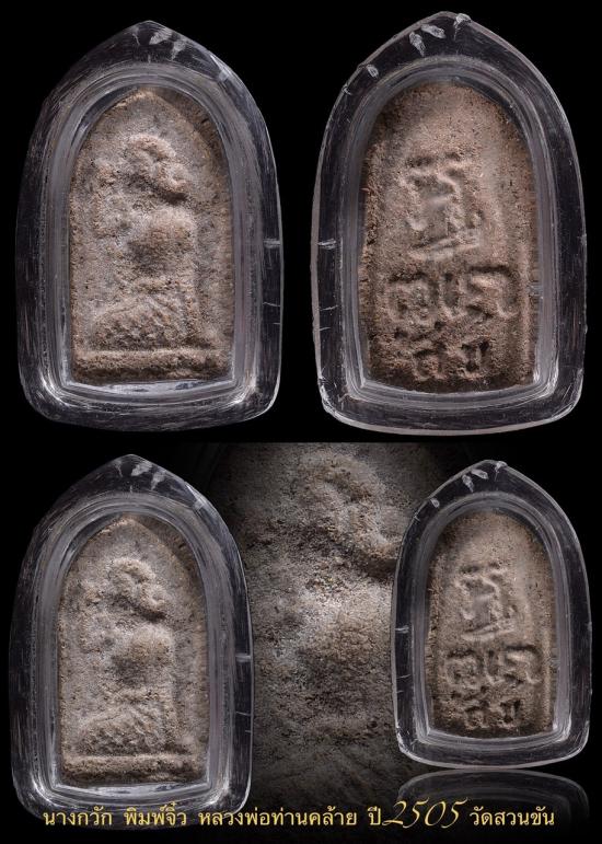 นางกวักพิมพ์จิ๋ว เนื้อว่านชานหมาก พ่อท่านคล้าย วาจาสิทธิ์แห่งวัดสวนขัน เป็นพระเนื้อว่านของพ่อท่านคล้ายที่สร้างขึ้นที่วัดสวนขันเป็นการสร้างพระเครื่องครั้งที่ยิ่งใหญ่ที่สุดของพ่อท่านคล้ายในบรรดาพระเครื่องที่ท่านสร้างไว้ทั้งหมด เพราะทำการปลุกและสมโภชที่วัดสวนขันเองตลอด 7 วัน 7 คืน ว่านที่ใช้ในการสร้างพระเครื่องหลวงพ่อเดชซึ่งเป็นรองเจ้าอาวาสต่อจากพ่อท่านคล้ายในสมัยนั้นได้ทำการสะสมรวบรวบรวมเป็นเวลานานนับ 10 ปี และประกอบกับผงว่านต่างๆ ที่อาจารย์ขุนพันธ์ได้มอบถวายให้ จึงเป็นมูลเหตุแห่งการสร้าพระผงรูปเหมือนและ ส.ข.พิมพ์ต่างๆของพ่อท่านคล้ายเพราะคำกล่าว "ของพ่อท่านคล้ายที่ว่า เราอยากจะสร้างพระไว้เป็นครั้งที่ยิ่งใหญ่และเป็นปฐมฤกษ์ไว้ให้ลูกหลาน" โดยจัดพิธีให้เป็นทางการสักครั้งหนึ่งโดยนิมนต์พระเกจิอาจารย์ที่สนิทสนมกันมากเป็นผู้ปลุกเสกด้วยอาทิ อาจารย์ทิม วัดช้างให้ อาจารย์นำ วัดดอนศาลา หลวงพ่อแดง วัดภูเขาหลัก ท่านอาจารย์หมุนวัดเขาแดง และเกจิเขาอ้ออีกมากมาย แม้กระทั่งพราหมณ์ช่วยในการประกอบพิธีพ่อท่านคล้ายก็เป็นคนเลือกเอง โดยพราหมณ์ที่จะเข้ามาในพิธีต้องถือศีลมาก่อน ก่อนจะเข้าพิธีได้ โดยพ่อท่านคล้ายนั้งปรกปลุกเสกเองไม่ขาดเลยแม้กระทั้งวันเดียวตลอด 7 วัน 7 คืน จำนวนการสร้างนั้นไม่มากเพราะผงว่านวิเศษต่างๆ ในการทำพิธีนี้ได้วัตถุมงคลไม่มากเพราะผงว่านพิเศษมีน้อย อาทิเช่น พระรูปเหมือนพิมพ์ใหญ่ พิมพ์เล็ก พิมพ์จิ๋ว นางกวัก และพระประจำวันพิมพ์ต่างๆ ฉะนั้นวัตถุมงคลในพิธีนี้จึงเป็นที่น่าบูชาและพกติดตัวเพื่อเป็นศิริมงคลแก่ตัวเองและครอบครัวยิ่งนัก
