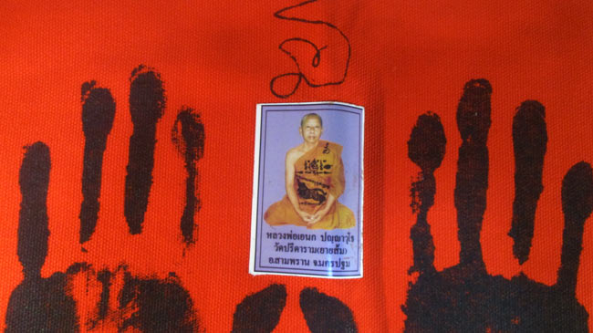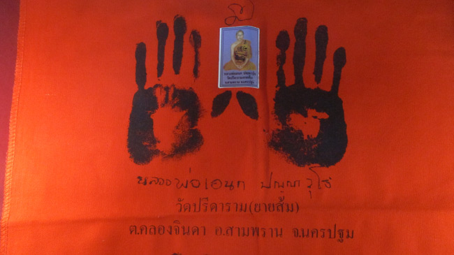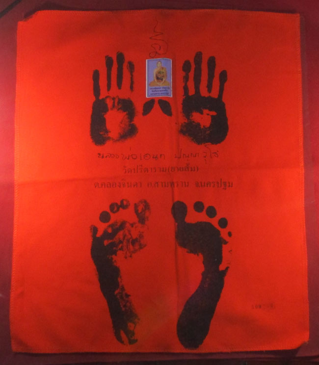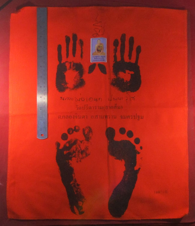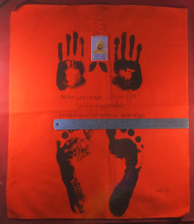 ผ้ายันต์ รอยมือ รอยท้าว หลวงพ่อเอนก ปุญญาวุโธ วัดปรีดาราม (ยายส้ม) ต.คลองจินดา อ.สามพราน จ.นครปฐม ครับ (พระบ้าน ครับ)