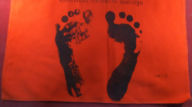 ผ้ายันต์ รอยมือ รอยท้าว หลวงพ่อเอนก ปุญญาวุโธ วัดปรีดาราม (ยายส้ม) ต.คลองจินดา อ.สามพราน จ.นครปฐม ครับ