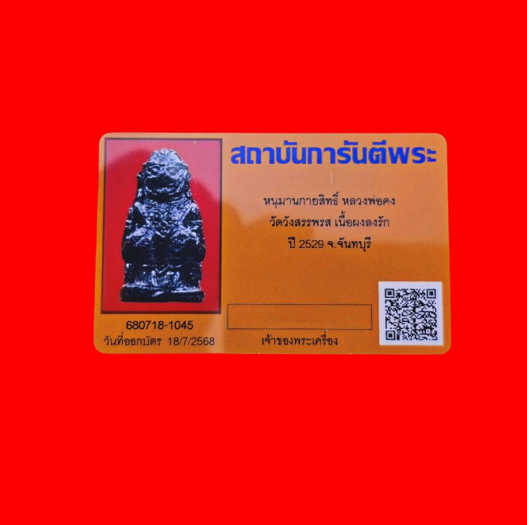 หนุมานกายสิทธิ์ รุ่นแรก พระครูอาคมวิสุทธิ์ หลวงพ่อคง สุวณฺโณ วัดวังสรรพรส จ.จันทบุรี เนื้อผงลงรัก ฝังตะกรุด ปี 2529 สวยเดิม ผิวเดิม พร้อมบัตรรับรองครับ รับประกันตามกฏทุกประการ